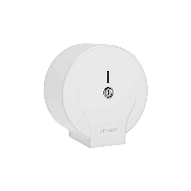 Dispensador de papel higiénico de acero lacado blanco.