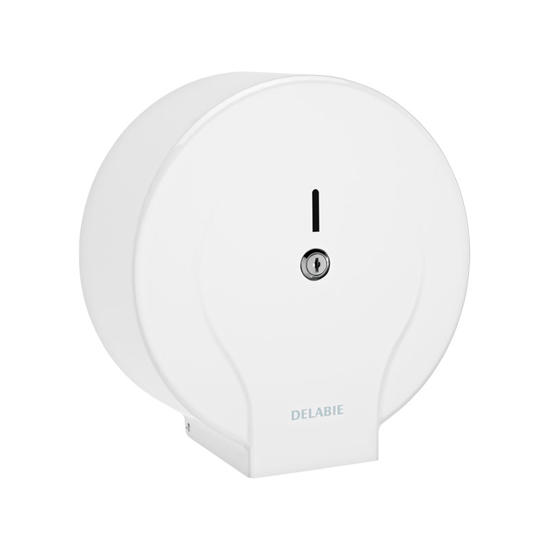 Dispensador de papel higiénico de acero lacado blanco.