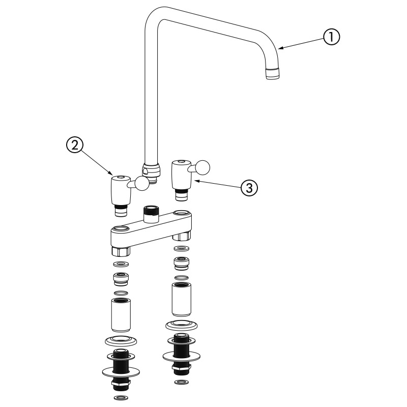 Ref. 5603Grifo mezclador 2 orificios de repisa M3/4" con distancia entre ejes de 150 mm sobre racores columna rectos para grandes fregaderos.