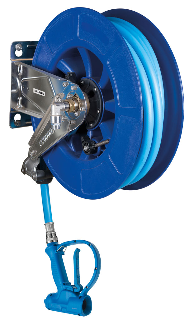 Ref. 5676T2Enrollador de manguera automático con pistola antigolpes y con manguera de L.15 m y rodillo guía.